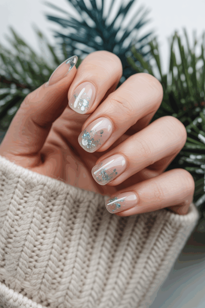This style uses clear nail polish with glitter flakes placed inside. It creates a subtle shine without covering the natural nail.