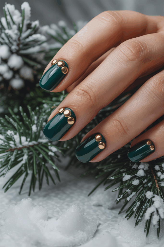Dark green nails paired with gold studs create a balanced look of elegance and edge. The deep green provides a rich base that suits winter tones well. Gold studs add subtle sparkle without overwhelming the design. This style works for both casual and festive settings.