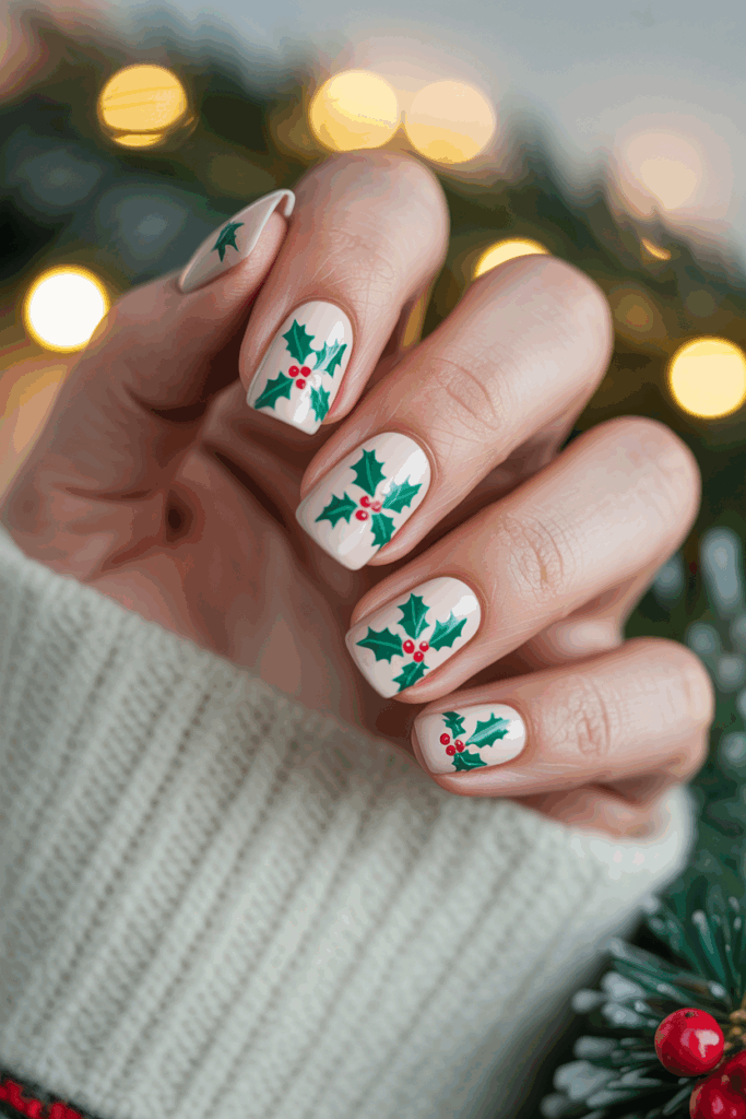 This nail art features holly leaves and bright red berries, perfect for a winter look. The design works well on a neutral or bold base color. It adds a simple, festive touch without being too flashy. Many choose this style for holiday events or everyday winter wear.