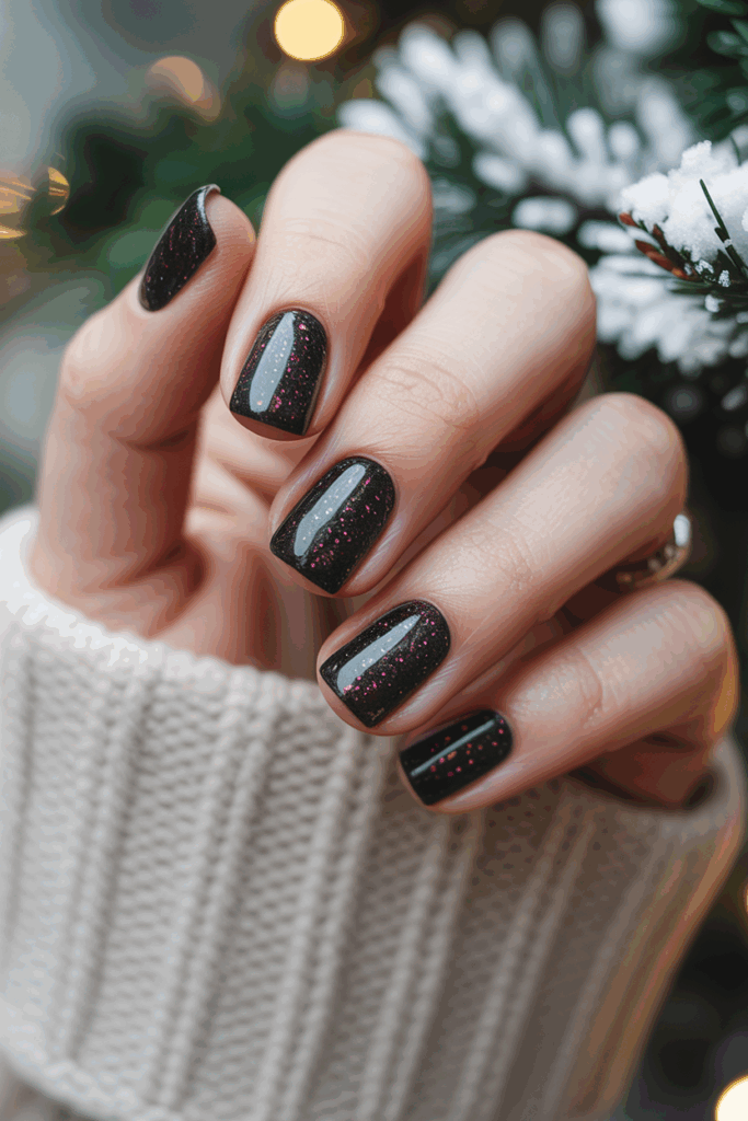 Short nails look stylish with glittery black polish. The dark color adds a bold touch while the glitter brings sparkle.