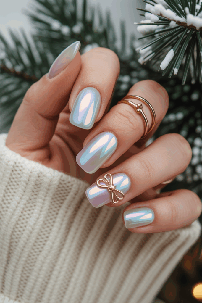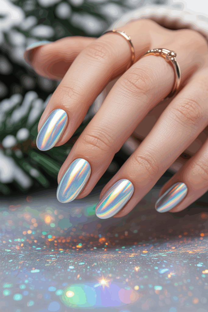 Holographic chrome nail polish creates a shiny, reflective finish with a rainbow-like effect. It combines the smooth mirror look of chrome with bright, shifting colors. This style is popular for winter nails because it adds a cool, modern touch without needing extra decorations.