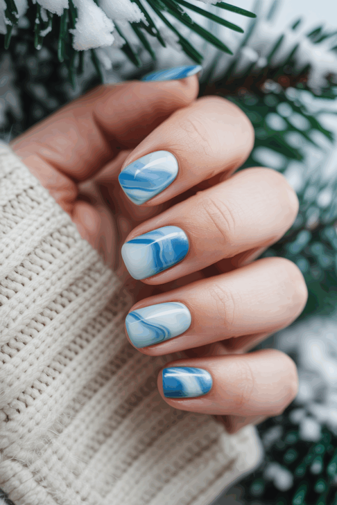 Marbled blue and white nails create a clean and stylish look. The mix of colors mimics natural stone patterns. This design works well for winter because it feels cool and elegant. It suits both short and long nails easily.