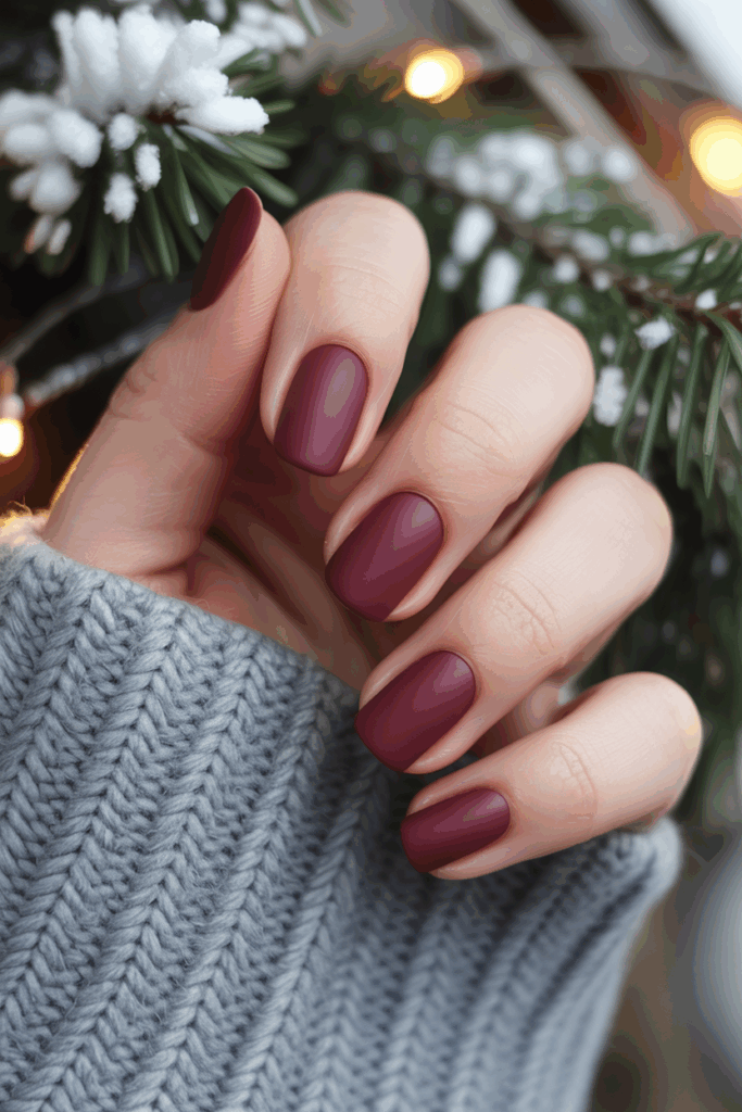 Rich burgundy nails with a matte finish offer a modern and elegant look. The deep, dark red tone pairs well with the velvety texture of matte polish. This style works for both casual and formal occasions, providing a subtle yet sophisticated appearance.