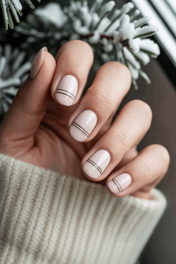 Soft pink nails create a calm, elegant base. Minimalist lines add simple, clean details without overwhelming the look.