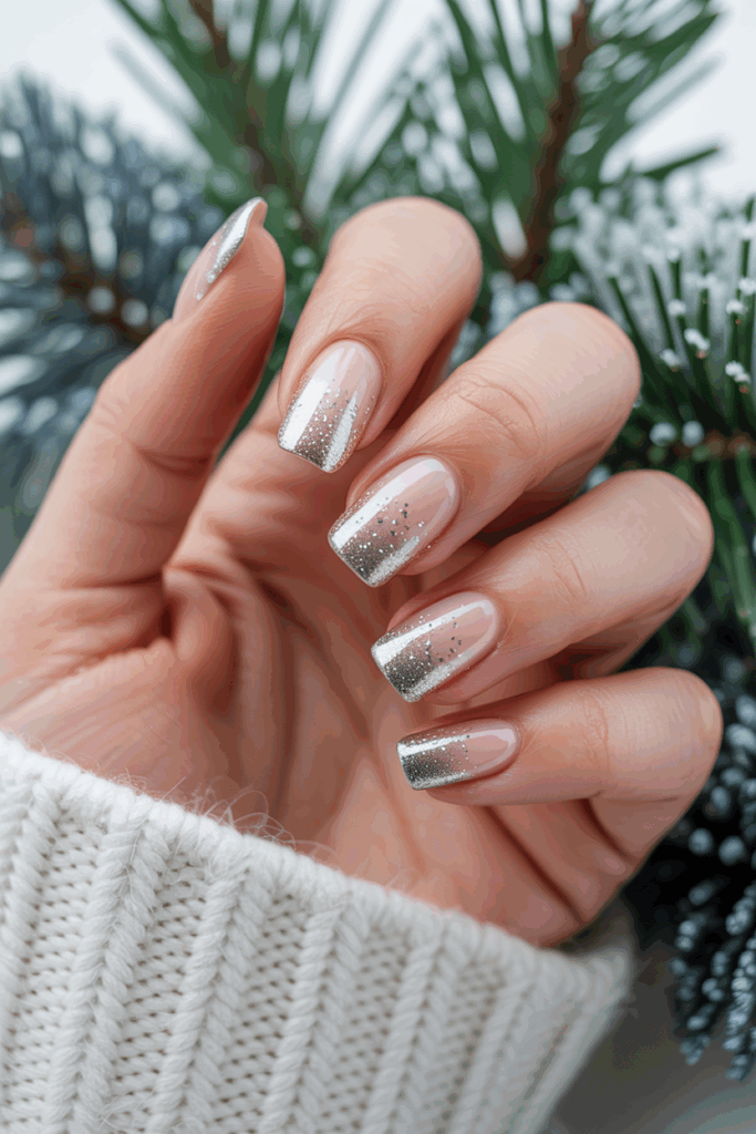 This design features silver glitter fading gently from the nail tips toward the base. It creates a smooth, elegant gradient that adds subtle sparkle without being overwhelming.