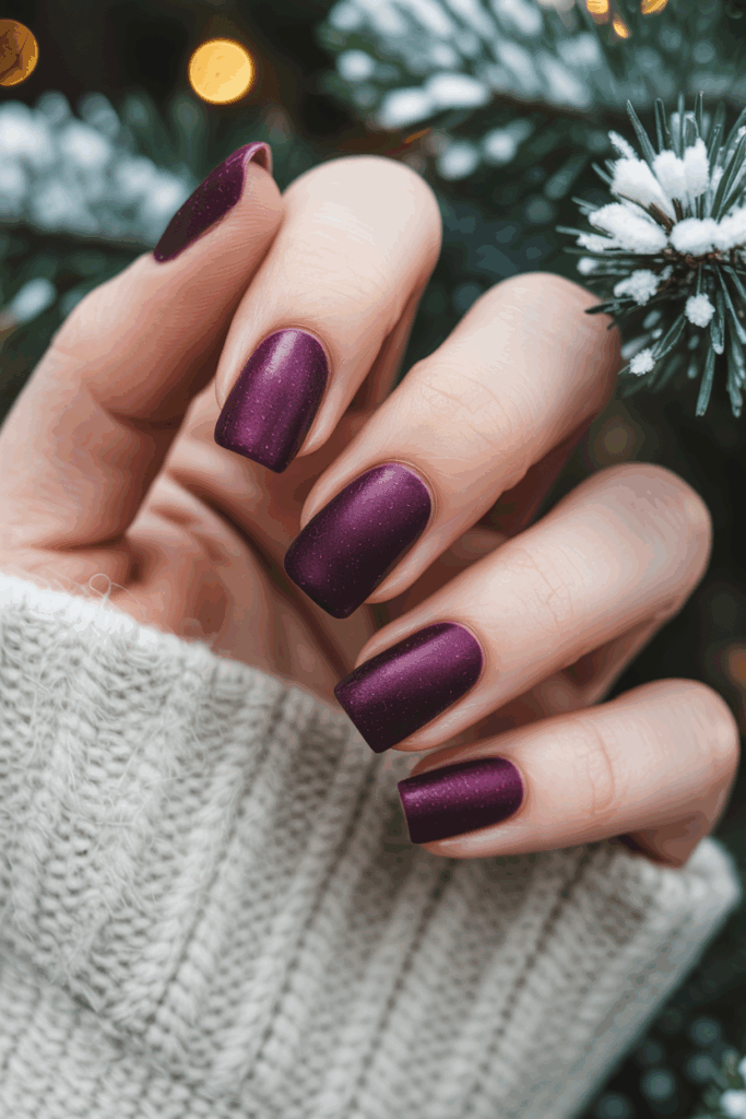 Velvet texture nails in dark plum bring a soft, rich look that fits well with winter styles.