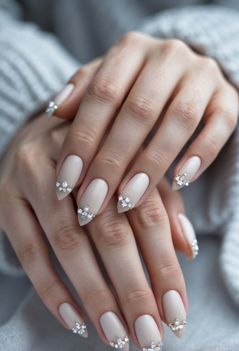 This nail design uses a soft beige base for a clean, elegant look. Tiny rhinestones add a subtle sparkle without being too flashy.