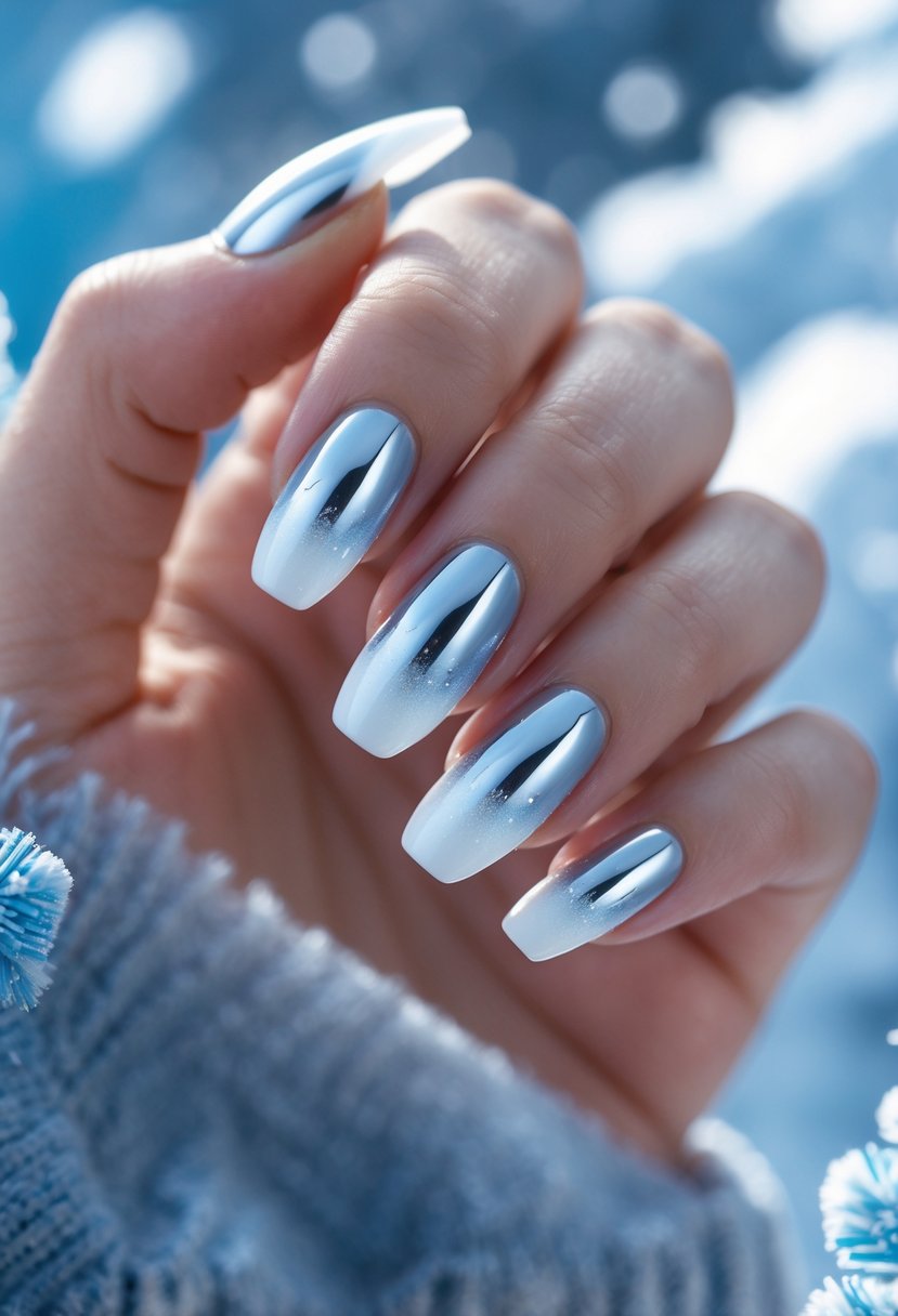 Chrome nails with frosty ombré combine shiny metallic finishes with soft, fading winter colors. This look offers a cool, modern vibe perfect for the season. It blends icy blues and silvers, creating a smooth transition from dark to light shades on the nails.