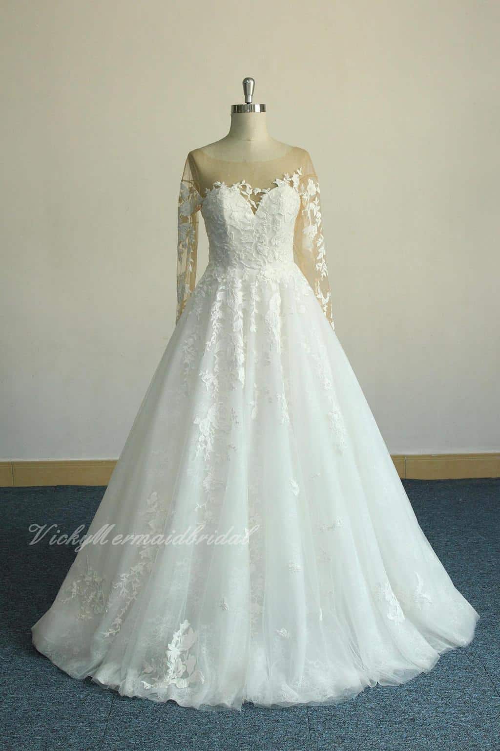 Romantic A-line ivory tulle lace wedding dress, open back high fashion wedding dress with nude long sleeves and sweetheart neckline by VickyMermaidBridal