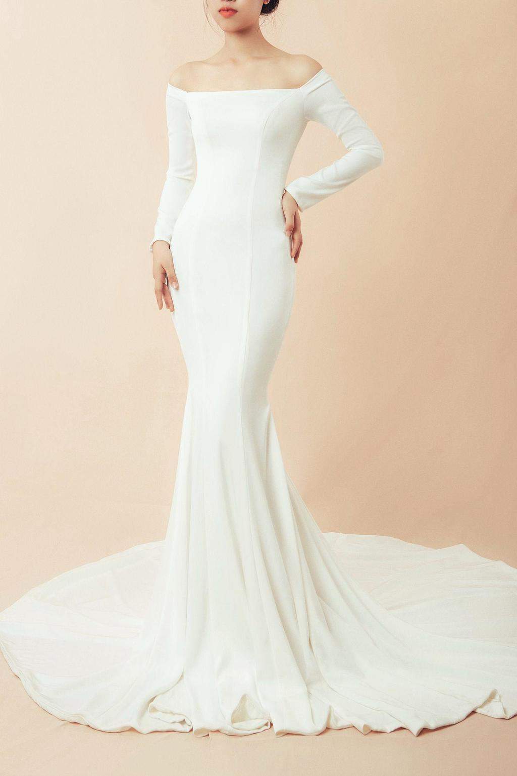 Crepe Mermaid Wedding Dress/ Off-the-shoulder Neck Long Sleeve/ Minimalist Bridal Gown – GORGONIA by SelfaBridal