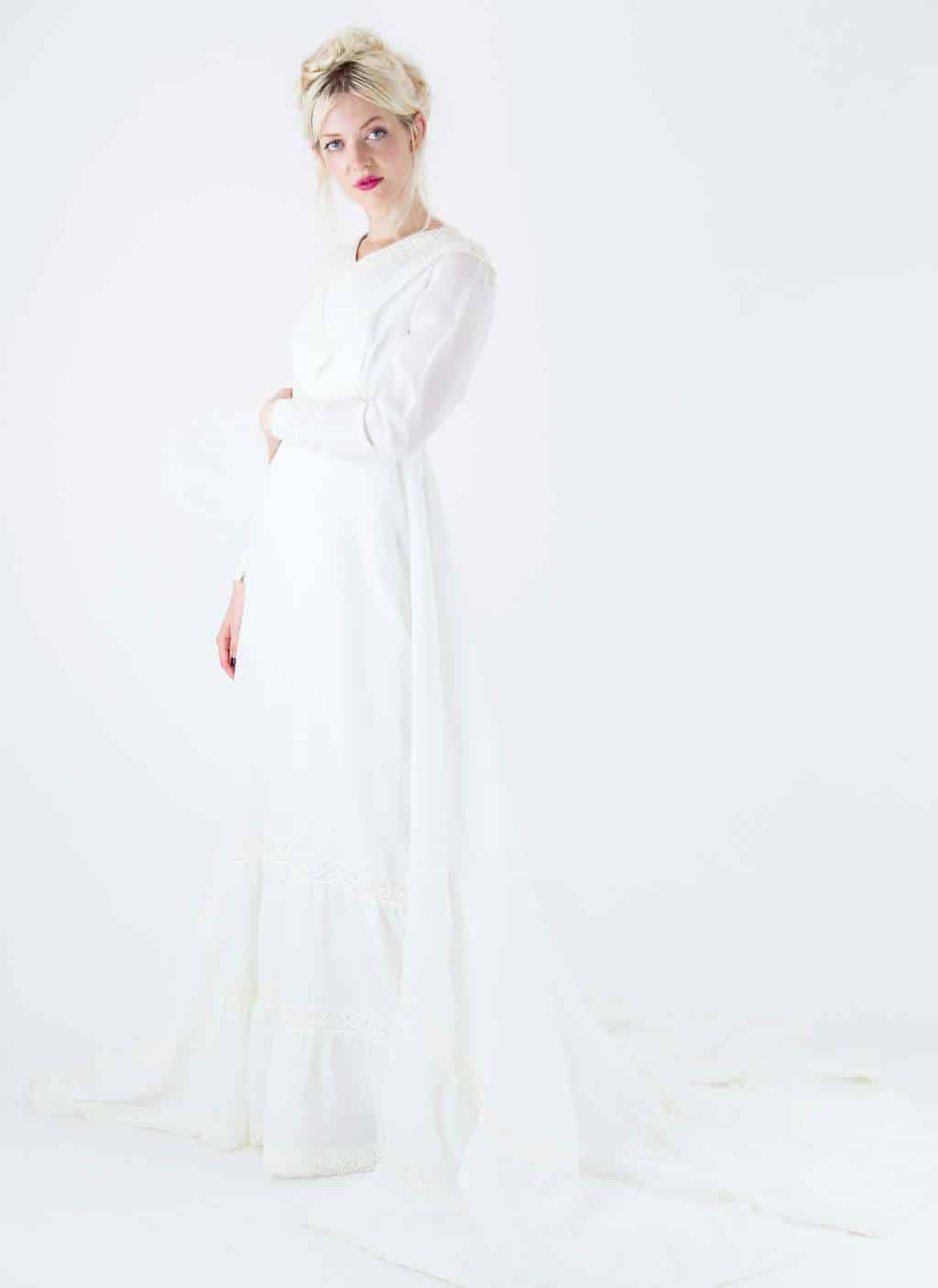 1970’s White Empire Line Lace Trim Wedding Dress with Sweeping Train by WYLDESYDEVINTAGE