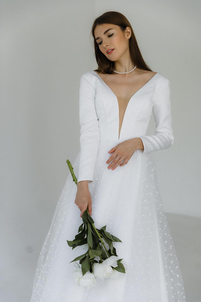 Minimalist A-line wedding dress with long sleeves, simple wedding gown with deep V-neckline by MiroNovaDress