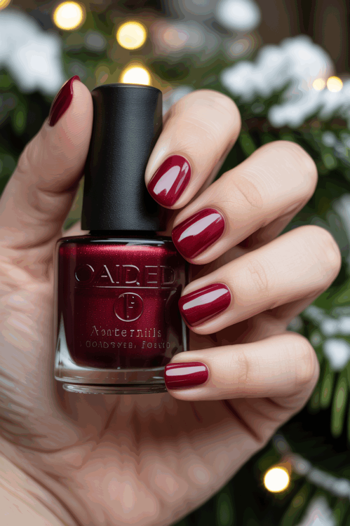 A deep winter red with a glossy finish or subtle shimmer feels timeless. Adding one accent nail keeps it modern.