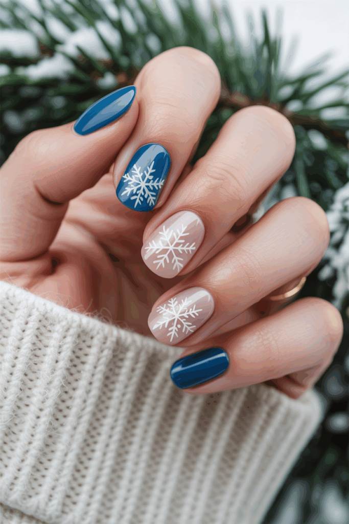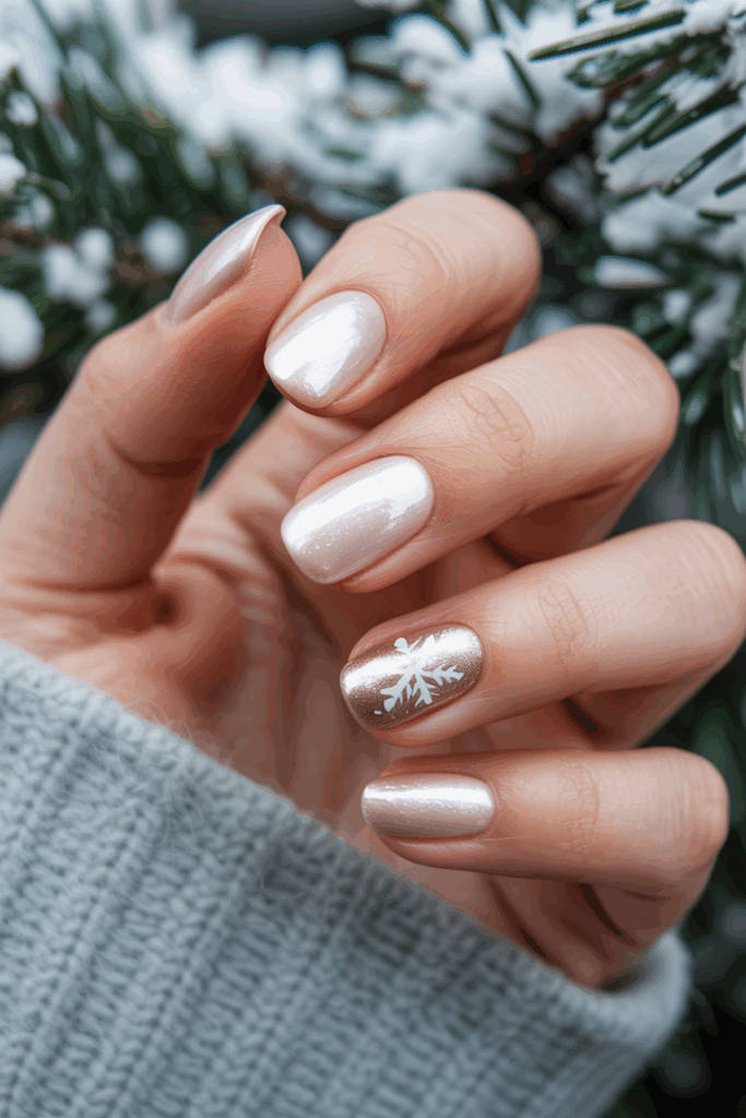 Rather than covering every nail in art, this design focuses on one or two delicate snowflakes placed on an otherwise neutral manicure. The rest of the nails remain simple, allowing the snowflake to stand out without overwhelming the look.