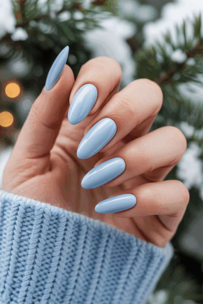 Soft ice blue nails in an almond shape feel elegant and flattering. The color elongates the fingers and feels fresh.