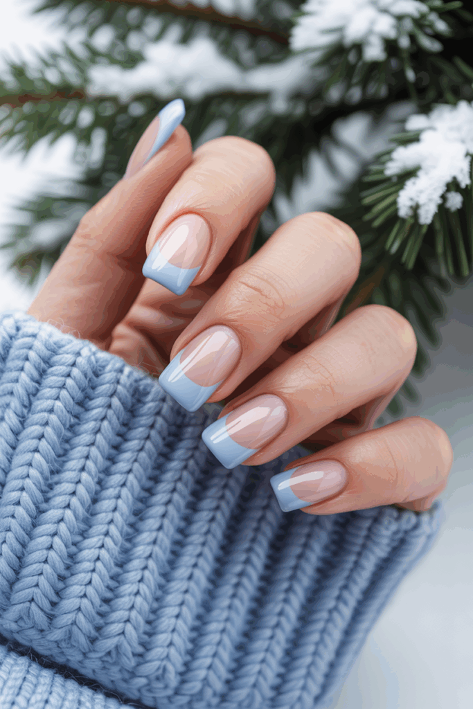 Frozen French tips look great with denim, knits, and neutral outerwear. The look is created by carefully painting soft blue tips over a nude base.