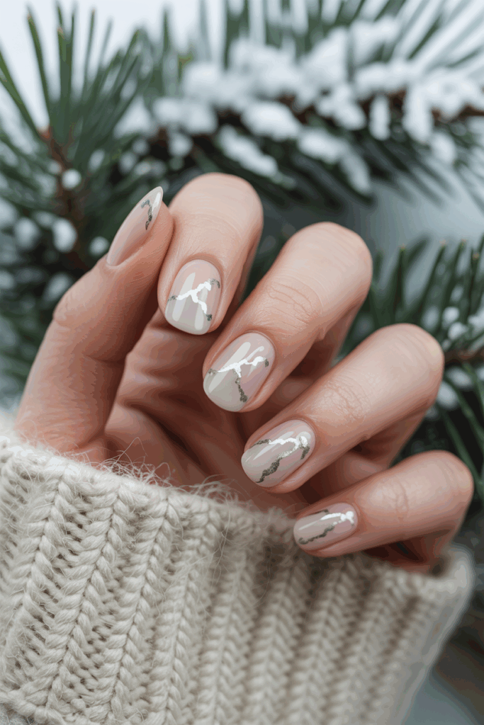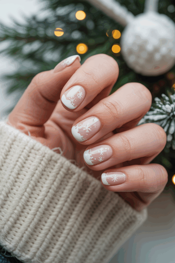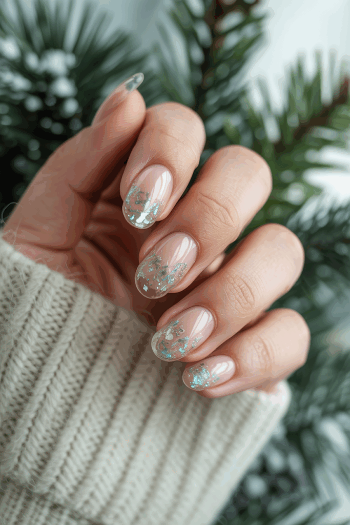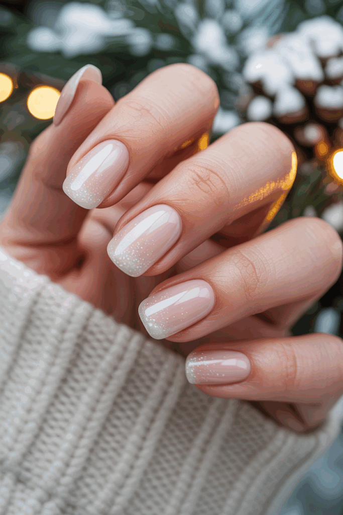 A nude base with a light dusting of shimmer at the tips gives a soft winter effect. It feels subtle and refined.