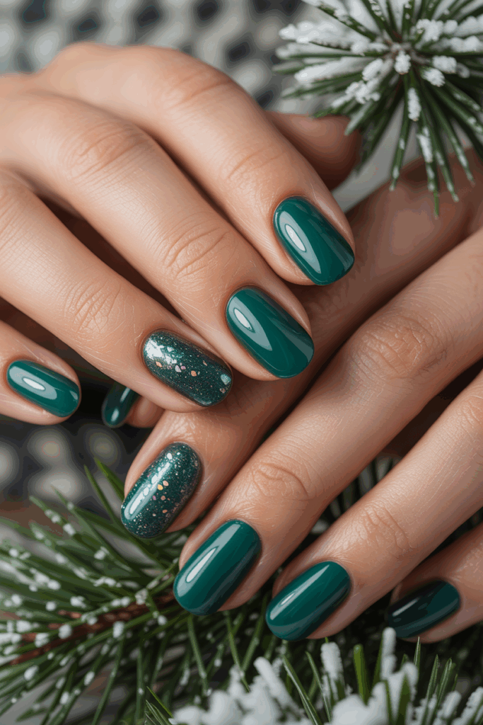 Deep green nails with subtle shimmer evoke winter forests and evergreen trees. The color feels rich and grounding.