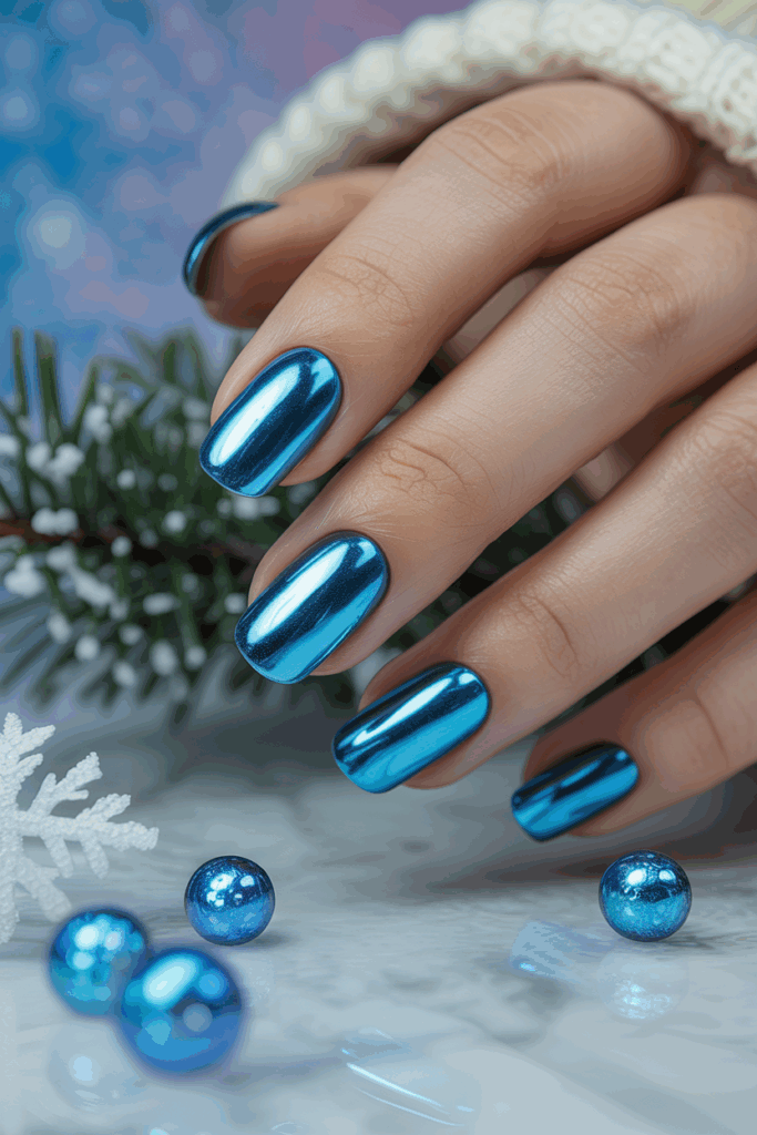 These nails look especially good with cool-toned outfits like grey wool coats, navy sweaters, or silver jewelry. The look is achieved by applying chrome powder over a light blue gel base and sealing it carefully to maintain the mirror finish.