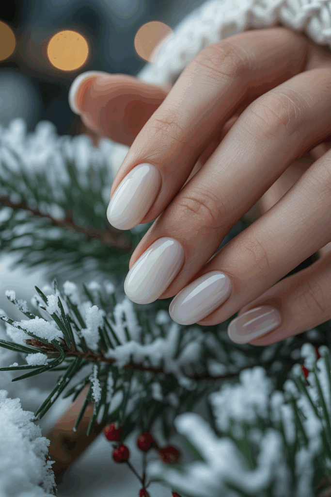 A winter version of the classic French manicure swaps stark white tips for a soft frosted shimmer. The base remains neutral, but the tips have a pearly or icy glow that feels seasonal and refined.