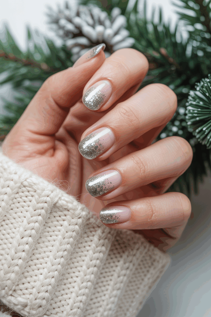 Silver glitter fades pair well with black, grey, or winter white outfits. The look is created by blending fine glitter polish over a clear or nude base, often using a sponge for a smooth gradient.